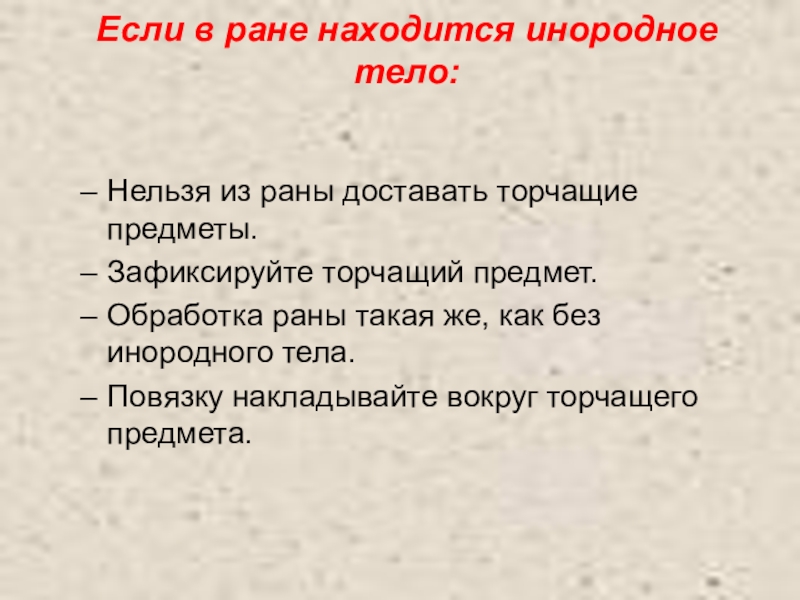 Если в ране находится инородное тело: Нельзя из раны доставать торчащие предметы.Зафиксируйте торчащий предмет.Обработка раны такая же,
