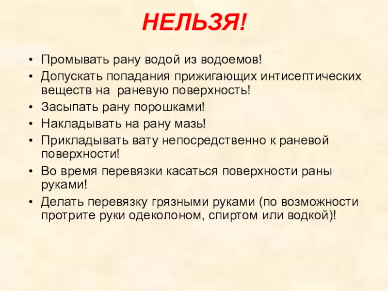 НЕЛЬЗЯ! Промывать рану водой из водоемов!Допускать попадания прижигающих интисептических веществ на раневую поверхность!Засыпать рану порошками!Накладывать на рану