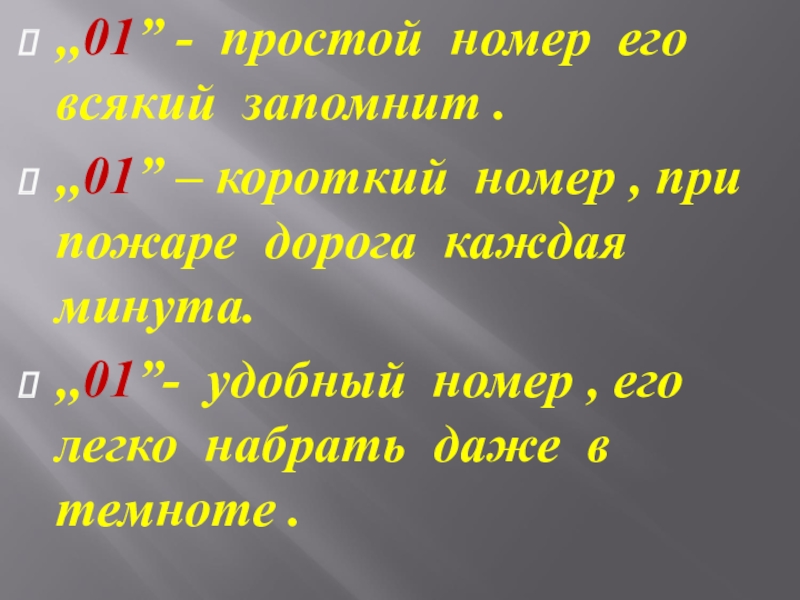 ,,01”- удобный номер , его легко набрать даже в темноте .