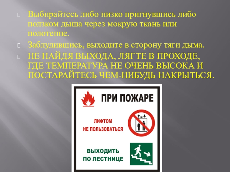 респиратором, ватно-марлевой повязкой, смоченными водой куском ткани или полотенцем. Двигайтесь пригнувшись или ползком (внизу меньше дыма).