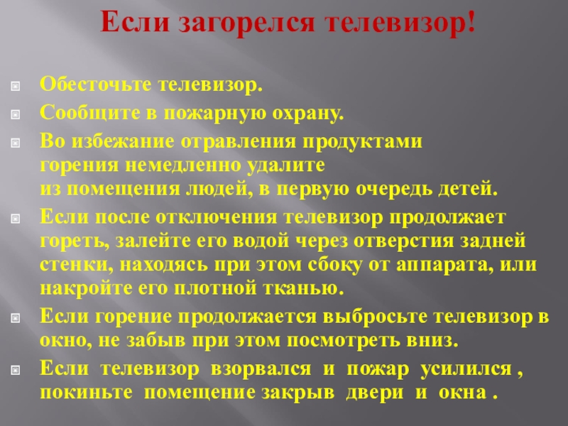 Если после отключения телевизор продолжает гореть, залейте его водой через отверстия задней стенки, находясь при этом сбоку от аппарата, или накройте его плотной тканью.