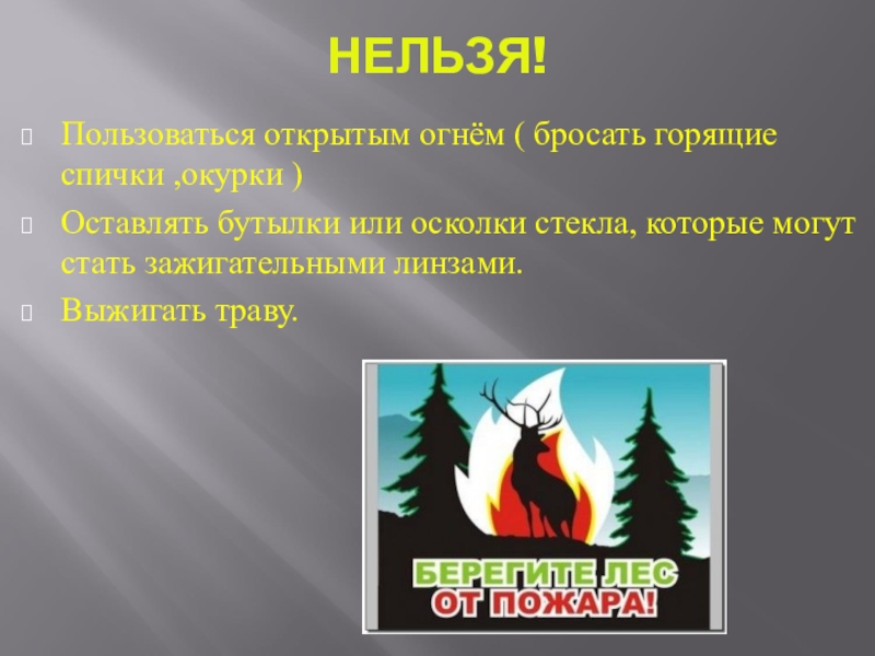 Пользоваться открытым огнём ( бросать горящие спички ,окурки )