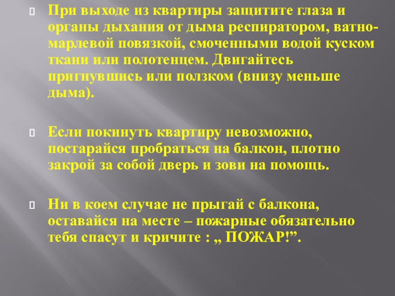 Слайд 4При выходе из квартиры защитите глаза и органы дыхания от дыма