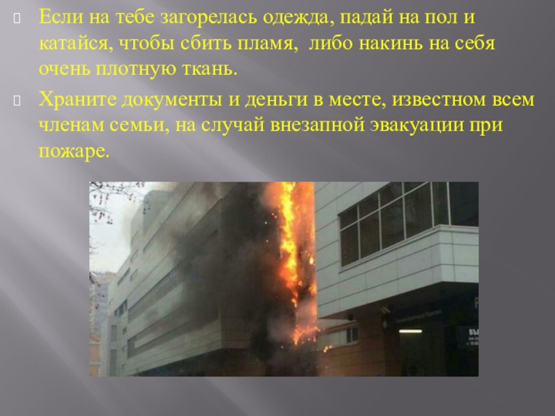 Слайд 5Если на тебе загорелась одежда, падай на пол и катайся, чтобы