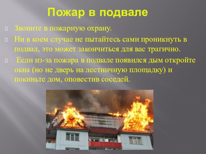 Если из-за пожара в подвале появился дым откройте окна (но не дверь на лестничную площадку) и покиньте дом, оповестив соседей.