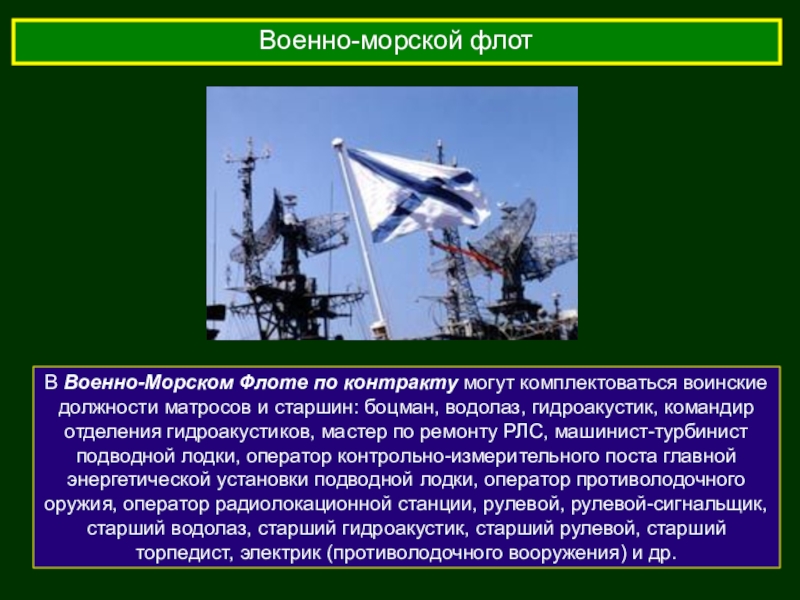 Условия контракта о прохождении военной службы включают в себя обязанности гражданина проходить военную службу в Вооруженных Силах Российской Федерации, других войсках, воинских формированиях или органах в течение установленного контрактом срока, добросовестно исполнять все общие, должностные и специальные обязанности военнослужащих.