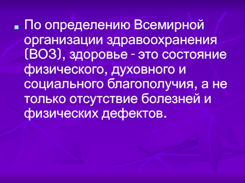 Слайд 4По определению Всемирной организации здравоохранения (ВОЗ), здоровье – это состояние физического,