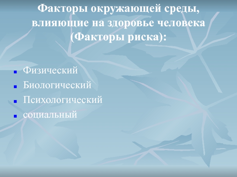 Факторы окружающей среды, влияющие на здоровье человека (Факторы риска):ФизическийБиологическийПсихологическийсоциальный