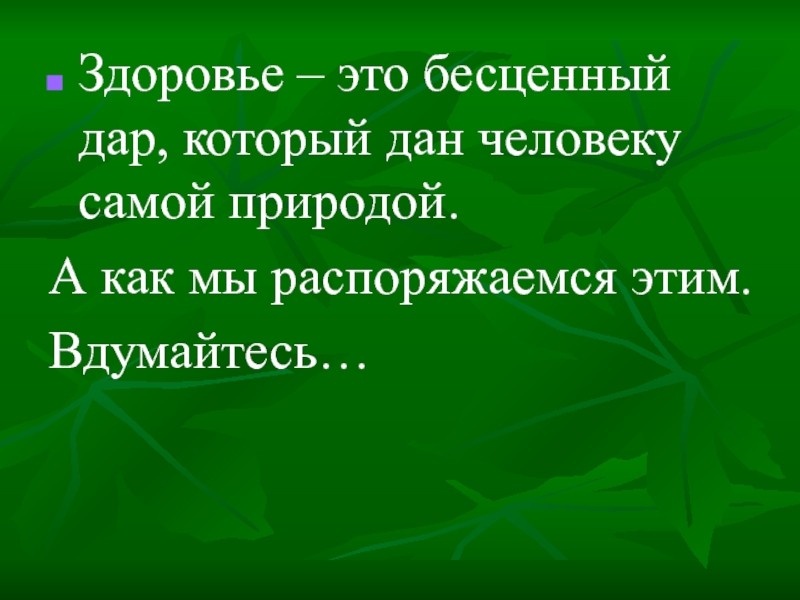 Здоровье – это бесценный дар, который дан человеку самой природой.А как мы распоряжаемся этим.Вдумайтесь…