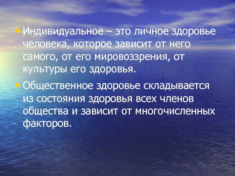Слайд 8Индивидуальное – это личное здоровье человека, которое зависит от него самого,