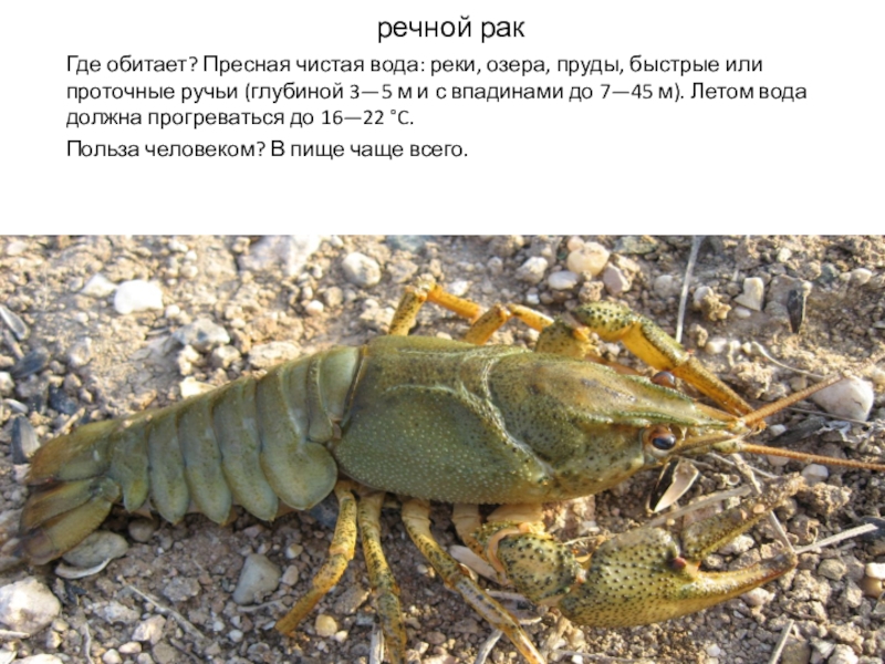 речной ракГде обитает? Пресная чистая вода: реки, озера, пруды, быстрые или проточные ручьи (глубиной 3—5 м и