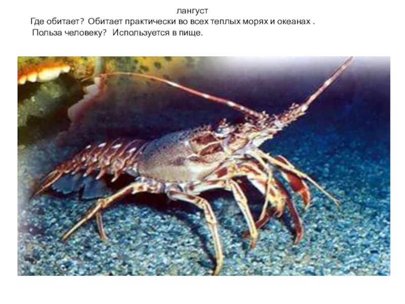 лангуст Где обитает? Обитает практически во всех теплых морях и океанах . Польза человеку? Используется в пище.