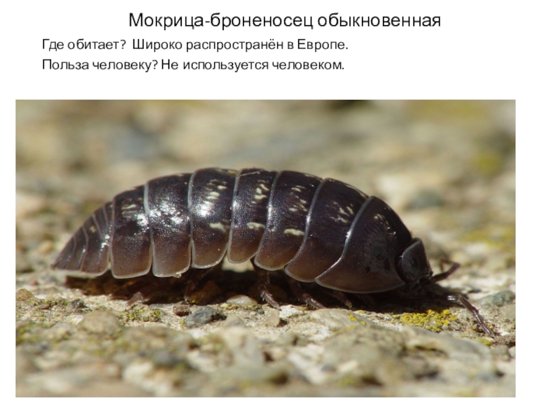 Мокрица-броненосец обыкновеннаяГде обитает? Широко распространён в Европе.Польза человеку? Не используется человеком.