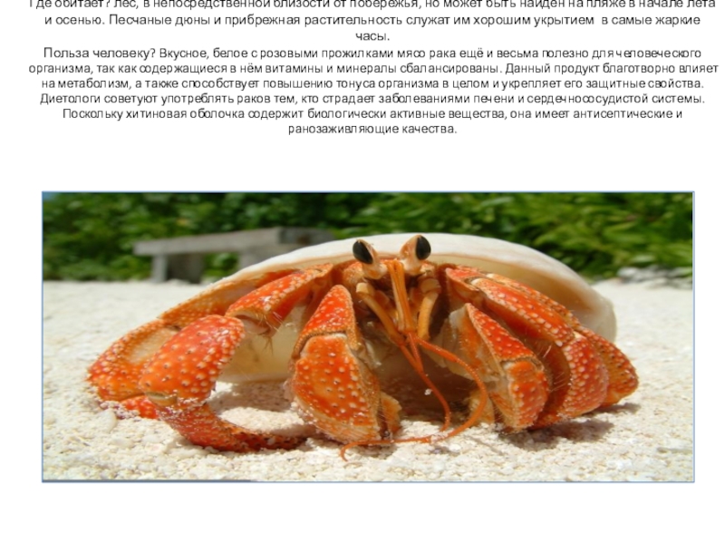 найден на пляже в начале лета и осенью. Песчаные дюны и прибрежная растительность служат им хорошим укрытием  в самые жаркие часы.  Польза человеку? Вкусное, белое с розовыми прожилками мясо рака ещё и весьма полезно для человеческого организма, так как содержащиеся в нём витамины и минералы сбалансированы. Данный продукт благотворно влияет на метаболизм, а также способствует повышению тонуса организма в целом и укрепляет его защитные свойства. Диетологи советуют употреблять раков тем, кто страдает заболеваниями печени и сердечнососудистой системы. Поскольку хитиновая оболочка содержит биологически активные вещества, она имеет антисептические и ранозаживляющие качества.
