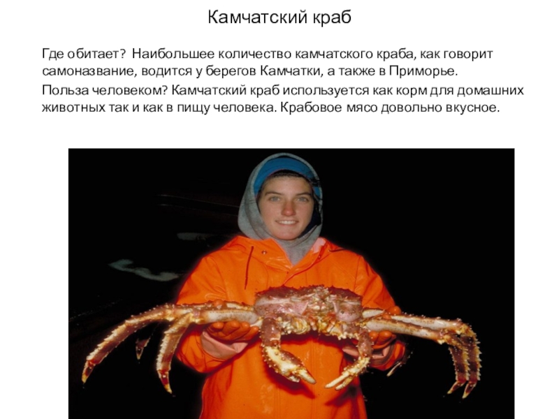 Слайд 3Краб Где обитает краб? на дне моря, океана. Польза человеку? Краб – ценнейший