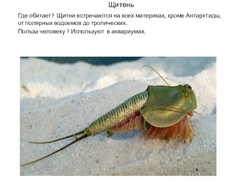 ЩитеньГде обитает? Щитни встречаются на всех материках, кроме Антарктиды, от полярных водоемов до тропических.Польза человеку ? Используют