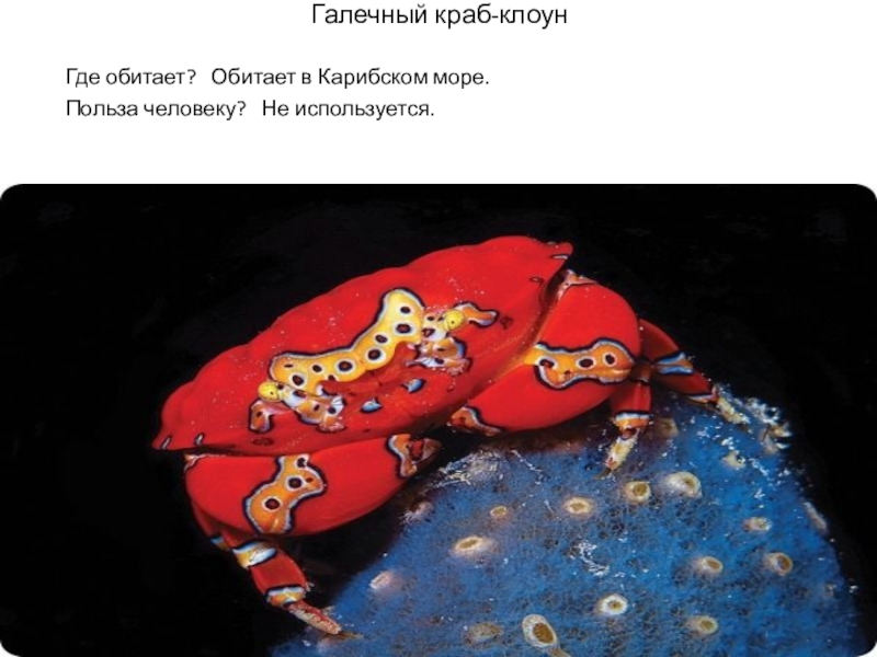 Галечный краб-клоунГде обитает?  Обитает в Карибском море.Польза человеку?  Не используется.
