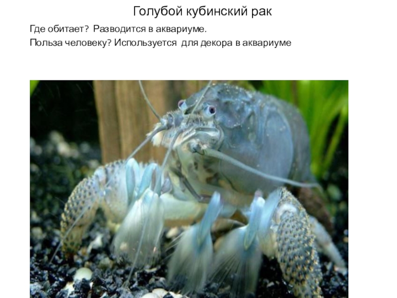Голубой кубинский ракГде обитает? Разводится в аквариуме. Польза человеку? Используется для декора в аквариуме