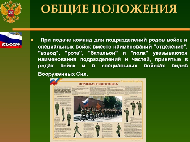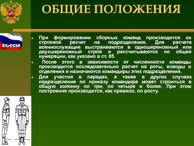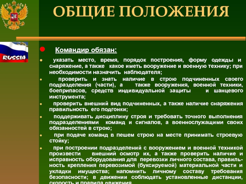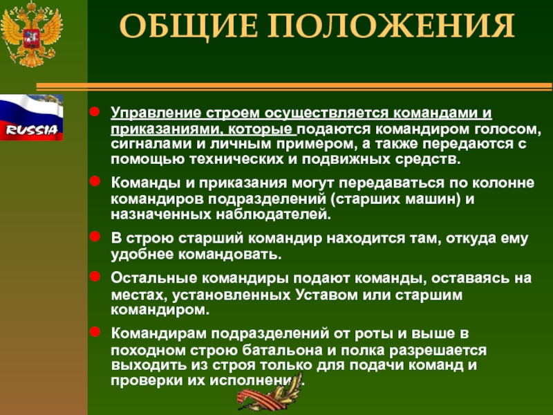 Командирам подразделений от роты и выше в походном строю батальона и полка разрешается выходить из строя только для подачи команд и проверки их исполнения.