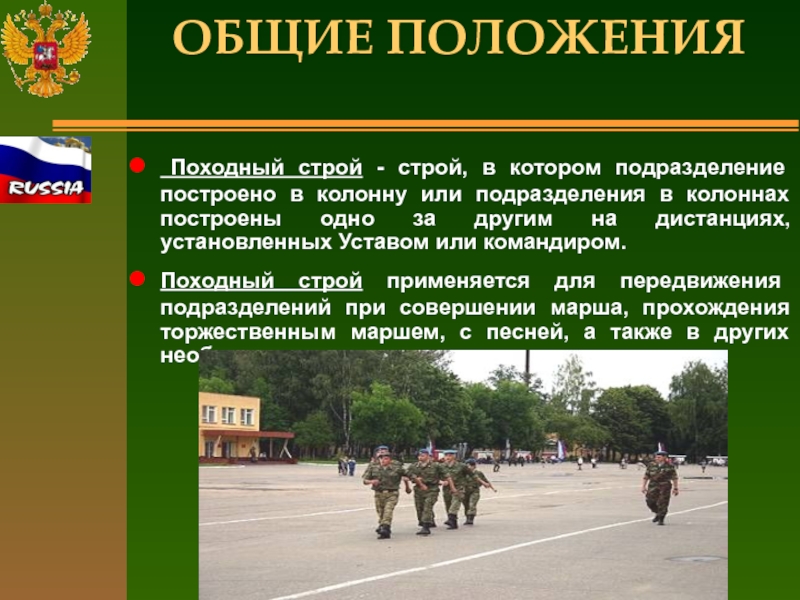 Походный строй применяется для передвижения подразделений при совершении марша, прохождения торжественным маршем, с песней, а также в других необходимых случаях.
