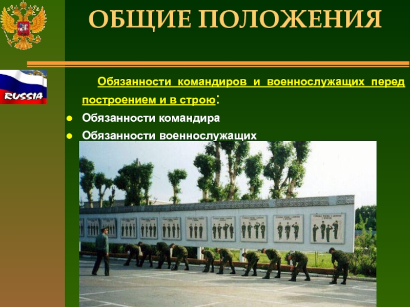 поддерживать дисциплину строя и требовать точного выполнения подразделениями команд и сигналов, а военнослужащими своих обязанностей в строю;