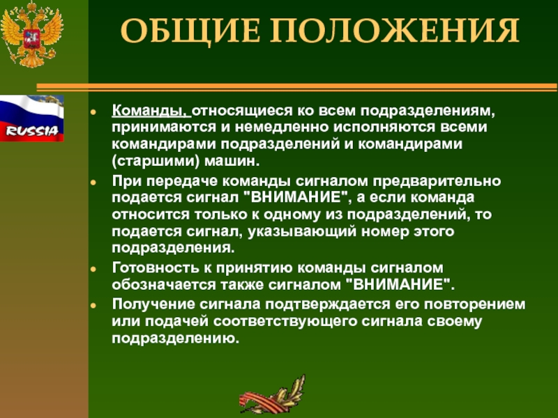 При передаче команды сигналом предварительно подается сигнал "ВНИМАНИЕ", а если команда относится только к одному из подразделений, то подается сигнал, указывающий номер этого подразделения.