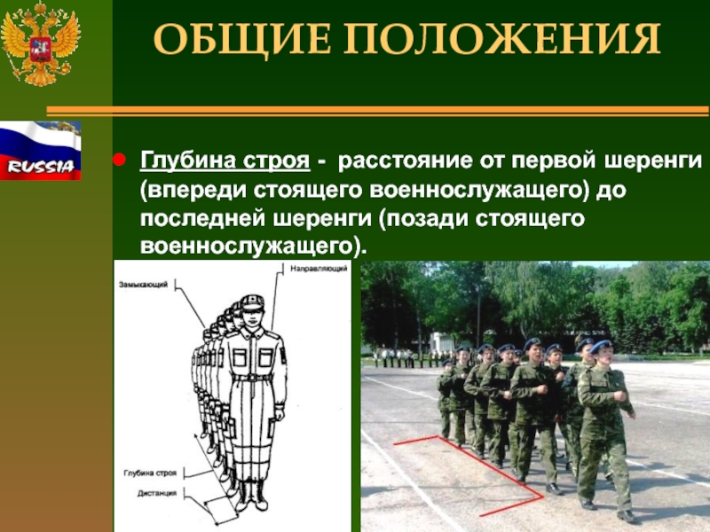 Глубина строя - расстояние от первой шеренги (впереди стоящего военнослужащего)