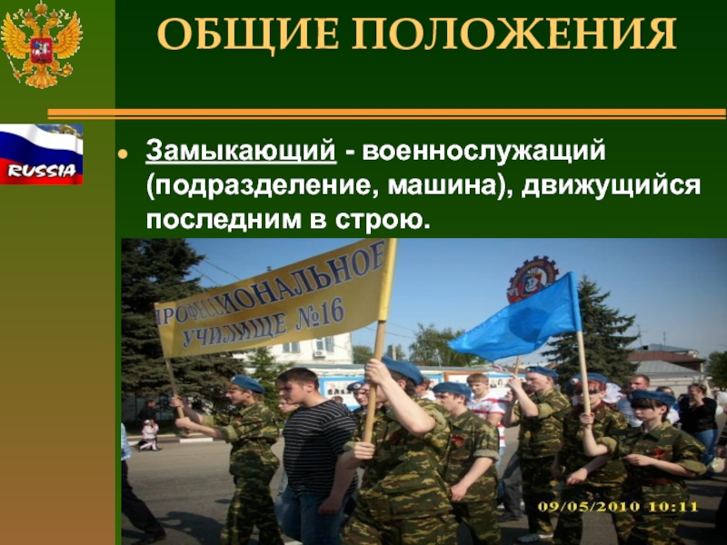 Замыкающий - военнослужащий (подразделение, машина), движущийся последним в строю.