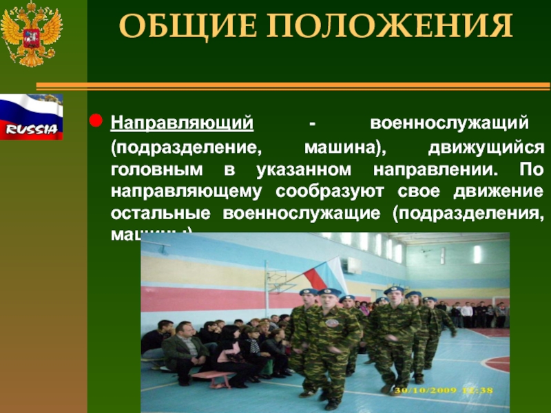 Направляющий - военнослужащий (подразделение, машина), движущийся головным в указанном направлении.