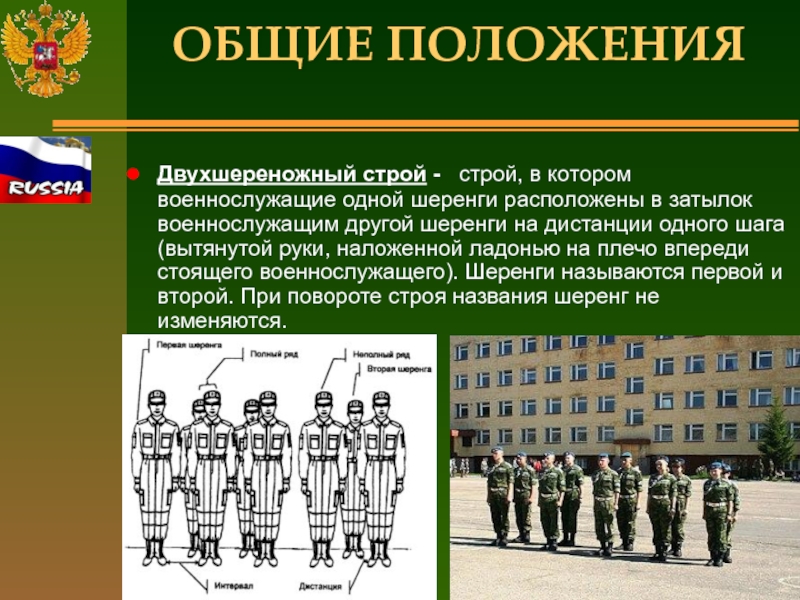 расположены в затылок военнослужащим другой шеренги на дистанции одного шага (вытянутой руки, наложенной ладонью на плечо впереди стоящего военнослужащего). Шеренги называются первой и второй. При повороте строя названия шеренг не изменяются.