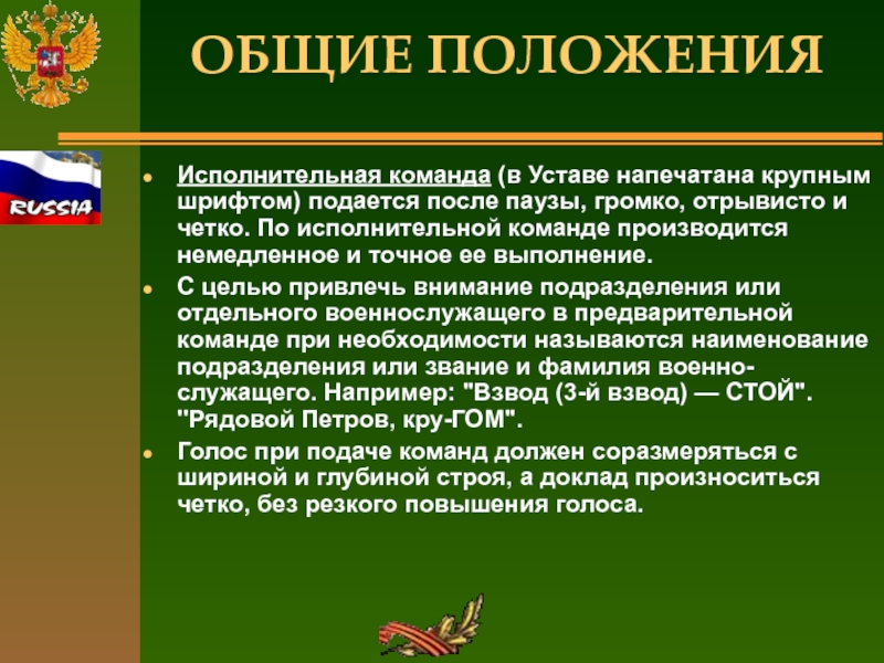 Исполнительная команда (в Уставе напечатана крупным шрифтом) подается после паузы,