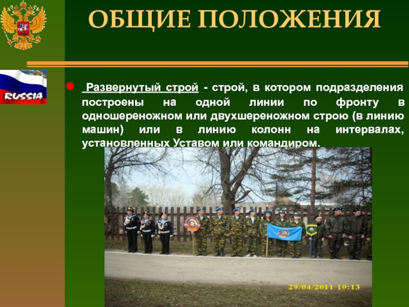 Строй – установленное Уставом размещение военнослужащих, подразделений и