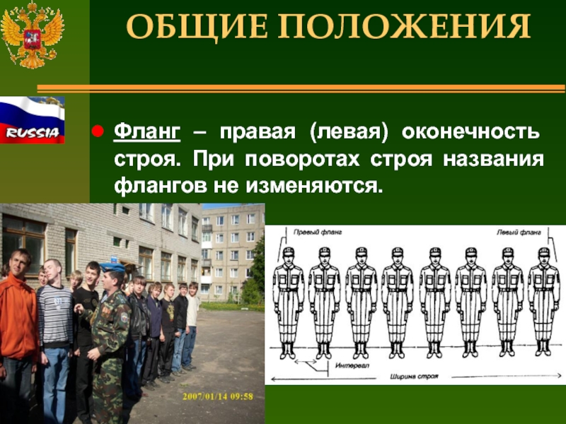 Фланг – правая (левая) оконечность строя. При поворотах строя названия