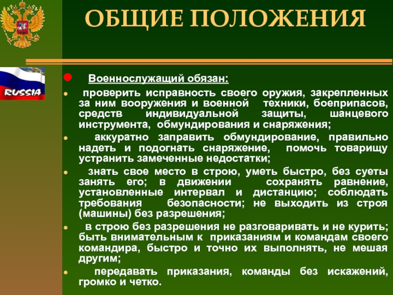 в строю без разрешения не разговаривать и не курить; быть внимательным к приказаниям и командам своего командира, быстро и точно их выполнять, не мешая другим;