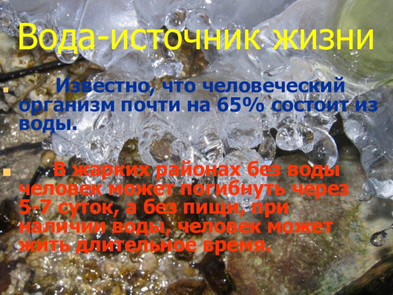 В жарких районах без воды человек может погибнуть через 5-7 суток, а без пищи, при наличии воды, человек может жить длительное время.