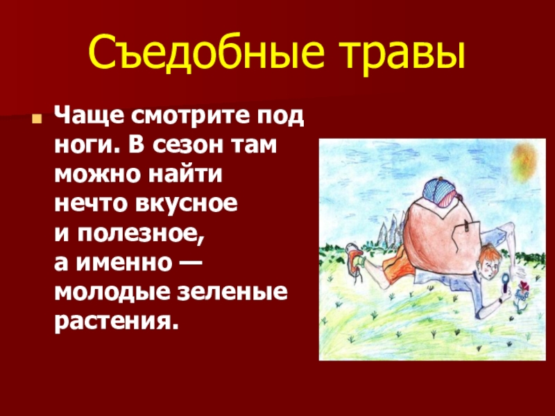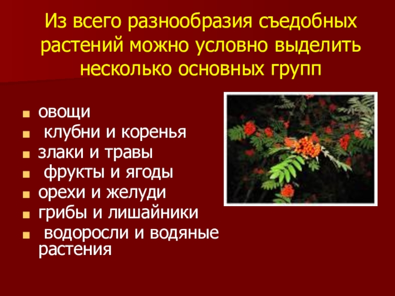 Слайд 15Из всего разнообразия съедобных растений можно условно выделить несколько основных групп