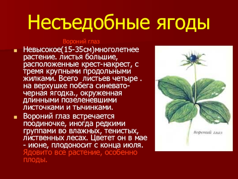 Вороний глаз встречается поодиночке, иногда редкими группами во влажных, тенистых, лиственных лесах. Цветет он в мае - июне, плодоносит с конца июля. Ядовито все растение, особенно плоды.