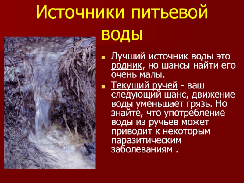 Текущий ручей - ваш следующий шанс, движение воды уменьшает грязь. Но знайте, что употребление воды из ручьев может приводит к некоторым паразитическим заболеваниям .