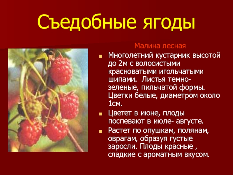 Растет по опушкам, полянам, оврагам, образуя густые заросли. Плоды красные , сладкие с ароматным вкусом.