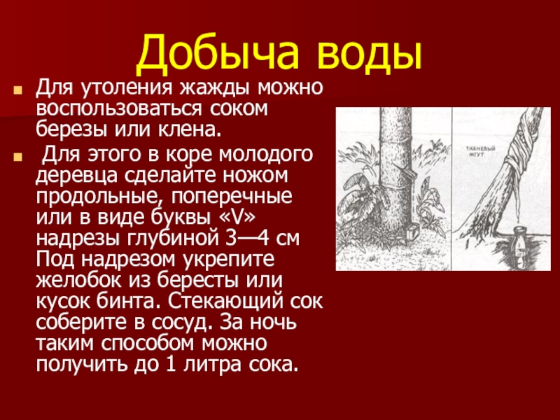 Для утоления жажды можно воспользоваться соком березы или клена.