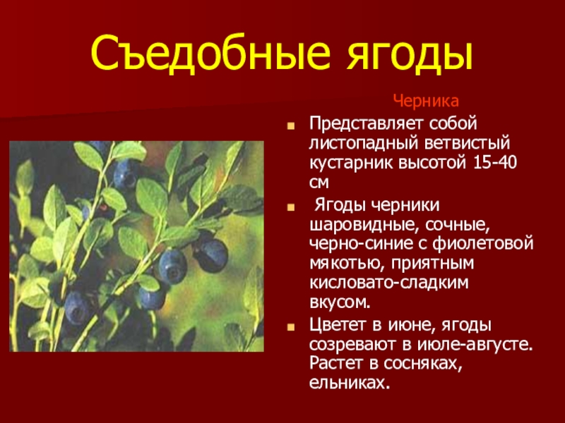 шаровидные, сочные, черно-синие с фиолетовой мякотью, приятным кисловато-сладким вкусом.