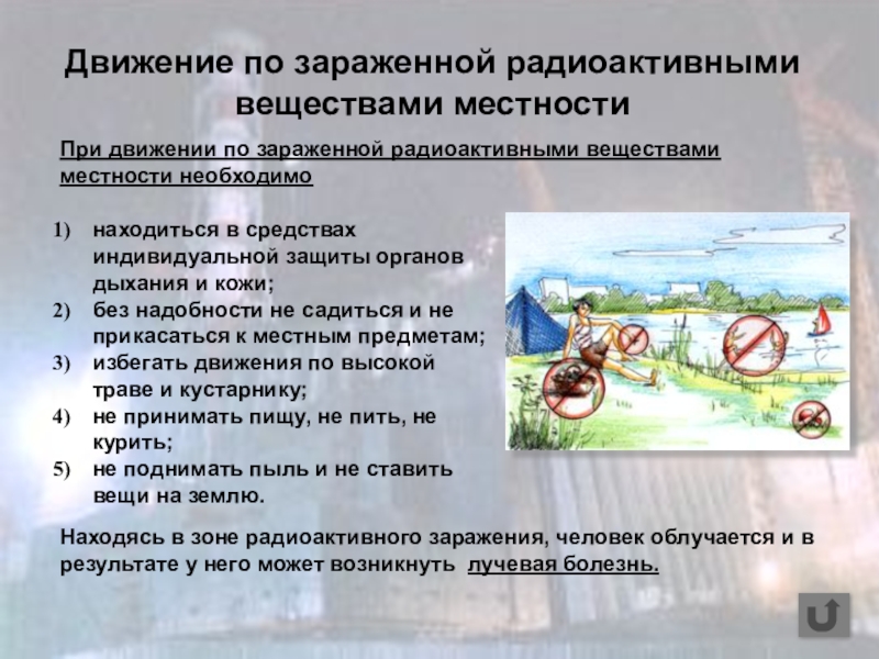Находясь в зоне радиоактивного заражения, человек облучается и в результате у него может возникнуть лучевая болезнь.