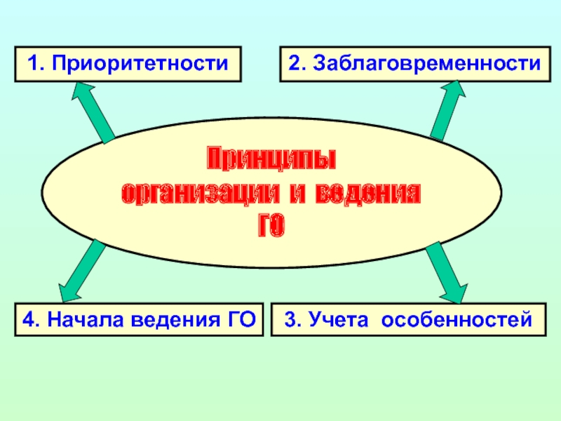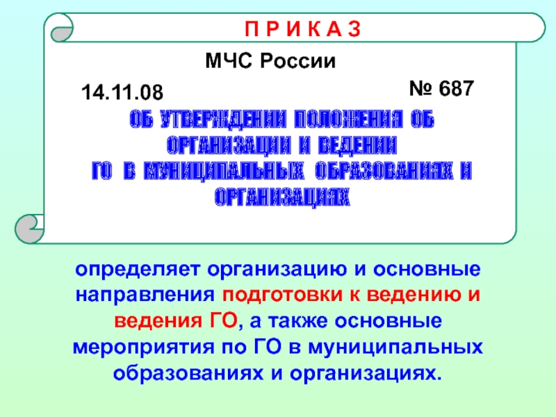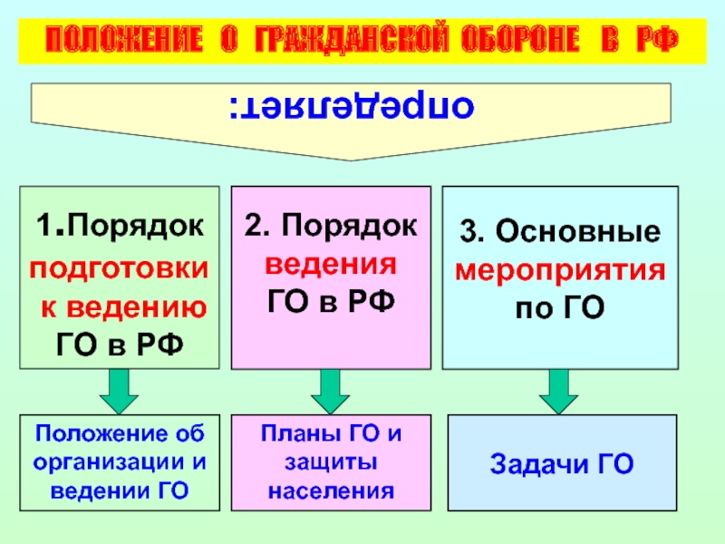 определяет организацию и основные направления подготовки к ведению и ведения ГО, а также основные мероприятия по ГО в муниципальных образованиях и организациях.