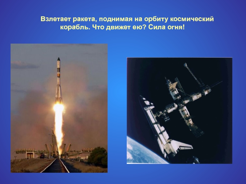 Слайд 10 Взлетает ракета, поднимая на орбиту космический