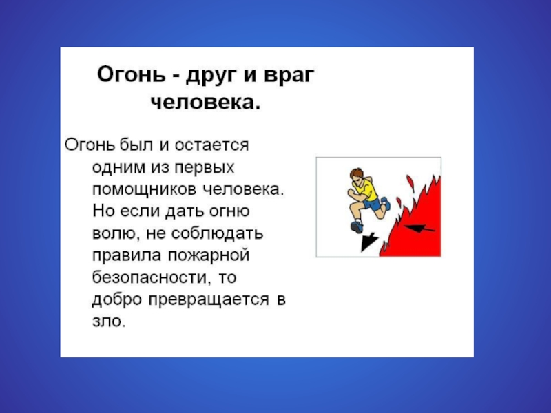 Люди научились добывать и сохранять огонь. Однако, выйдя из-под контроля человека, он превращается в страшное бедствие-пожар.