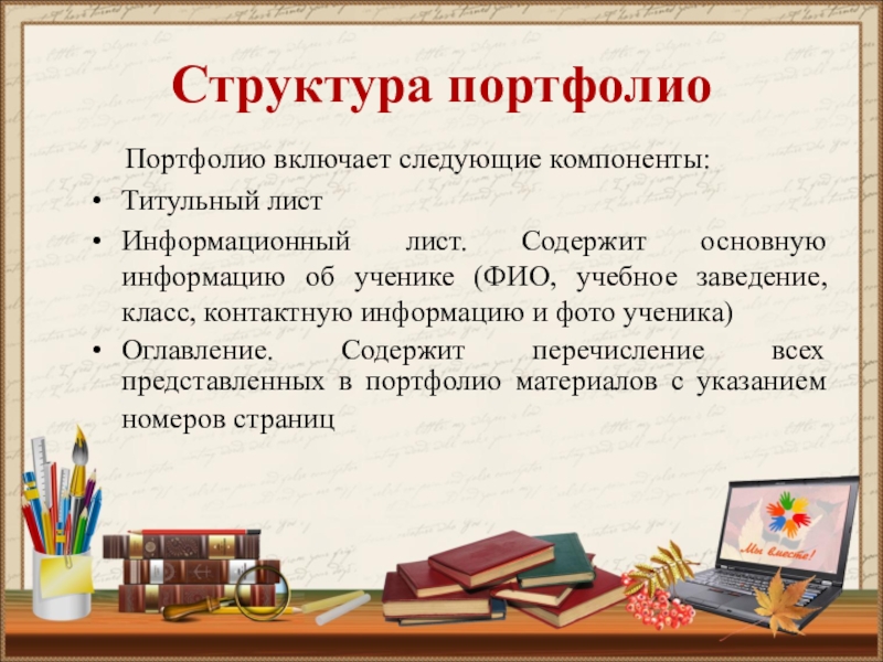 оценки индивидуальных достижений школьника в определенный период его обучения в виде рабочей файловой папки, которая документирует приобретенный опыт и успехи учащегося.