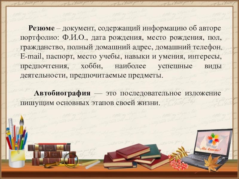 Слайд 9 Резюме – документ, содержащий информацию об авторе портфолио: Ф.И.О.,