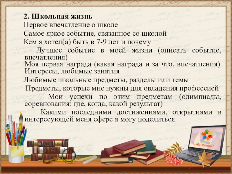 Автобиография рассматривается как документ к портфолио, поэтому, отвечая на вопросы, используйте не односложные, а распространенные предложения, чтобы в итоге получился расширенный обзор автобиографии.