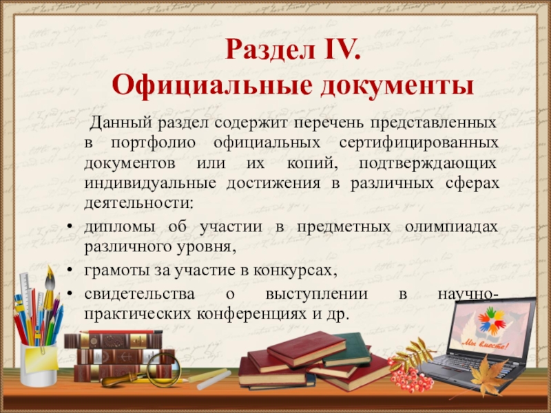 Слайд 15 Данный раздел содержит перечень представленных в портфолио официальных сертифицированных