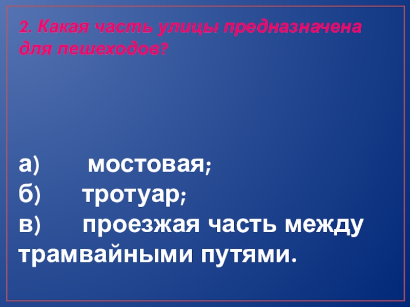 2. Какая часть улицы предназначена для пешеходов?      а)       мостовая; б)      тротуар; в)